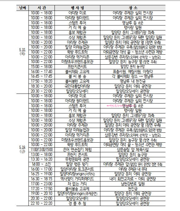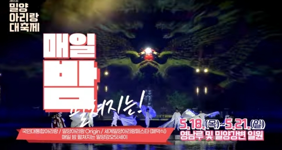 먼저, '밀양 아리랑 대축제'는 2023년 5월 18일부터 21일까지 4일간 밀양시 일대에서 개최됩니다. 이 축제는 밀양의 중심지인 영남루 및 밀양강변 일원에서 열리며, 축제 기간 동안에는 아리랑 관련 다양한 행사와 프로그램이 준비되어 있습니다. 이 축제는 밀양강 오딧세이, 밀양아리랑 콘텐츠 등 다양한 콘텐츠로 방문객들에게 밀양의 아름다움과 아리랑 문화의 깊이를 보여줍니다. 축제의 재미를 더해주는 것은 물론, 밀양의 아름다운 자연과 도시 풍경을 동시에 즐길 수 있습니다.