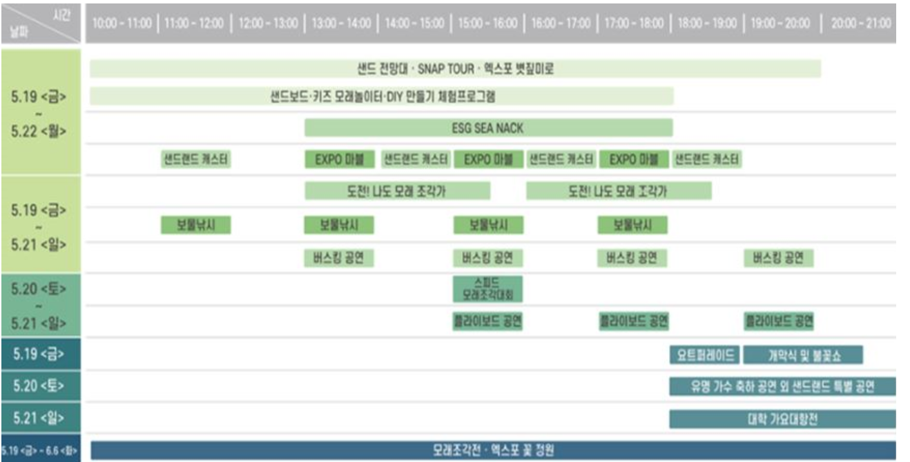 이 밖에도 다양한 프로그램들이 있어, 해운대 모래축제는 부산 방문 시 필수적인 행사로 꼽힙니다. 이런 다양한 행사들은 해운대 해수욕장 및 해운대 광장 일원에서 열립니다. 행사장 지도를 미리 확인하면 각 프로그램을 놓치지 않고 효율적으로 즐길 수 있습니다.