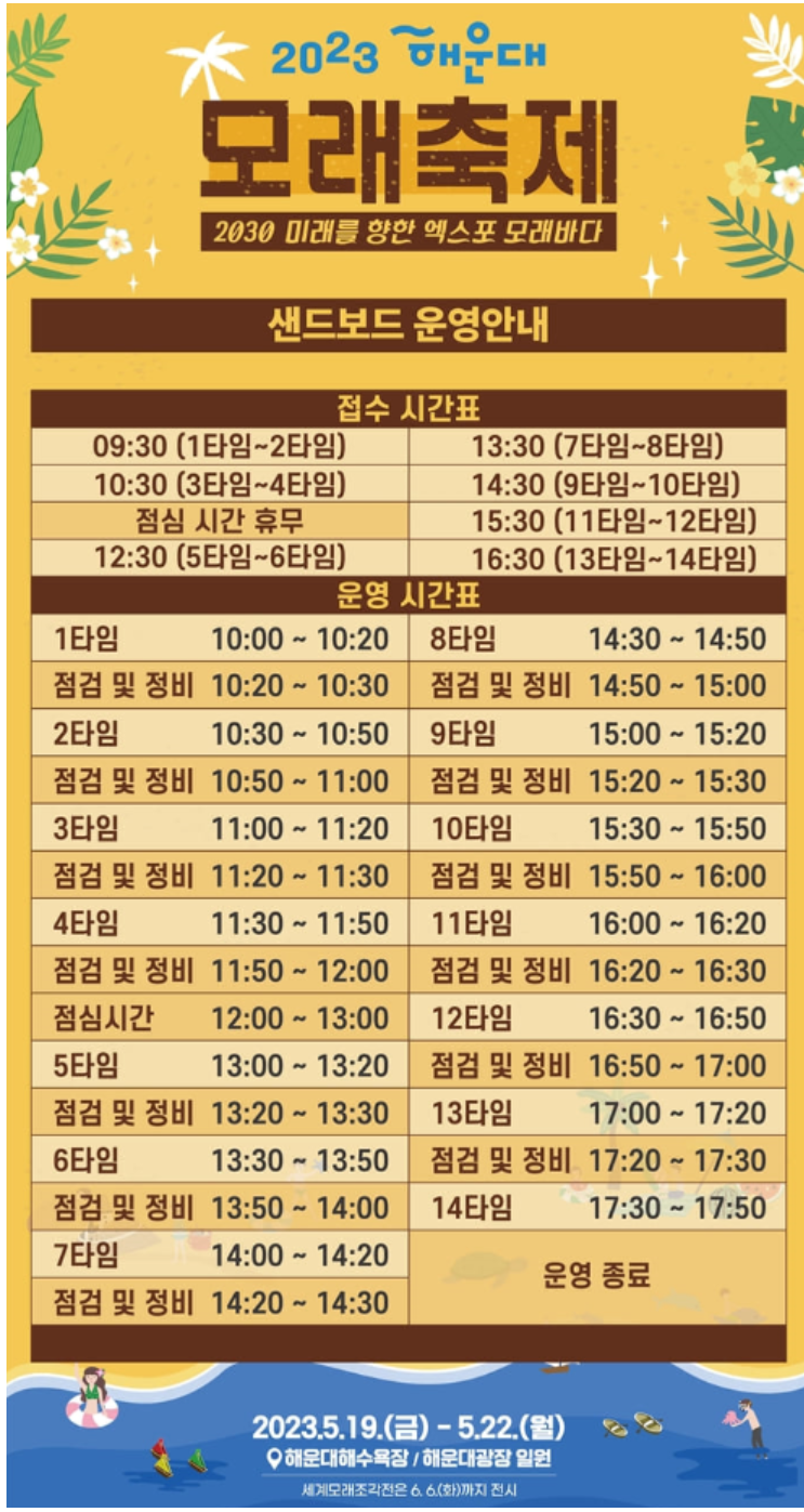 2023 해운대 모래축제는 5월 19일부터 22일까지 진행되며, 주제는 '2030 미래를 향한 엑스포 모래바다'입니다.