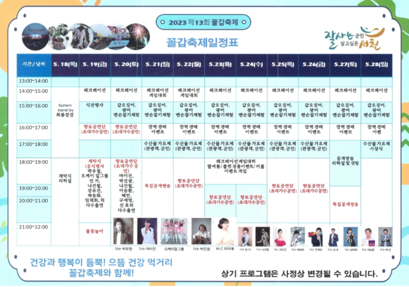 5월 19일에는 개막식과 가수 공연, 그리고 화려한 불꽃놀이가 진행됩니다. 이후 축제 기간 내내 가수들의 공연과 품바공연, 갑오징어와 광어 맨손잡기 체험, 수산물 트롯 가요제, 그리고 깜짝 경매 이벤트 등이 준비되어 있습니다. 이런 다양한 프로그램들을 통해 방문객들은 즐거움과 함께 신선한 해산물의 맛을 체험할 수 있습니다.