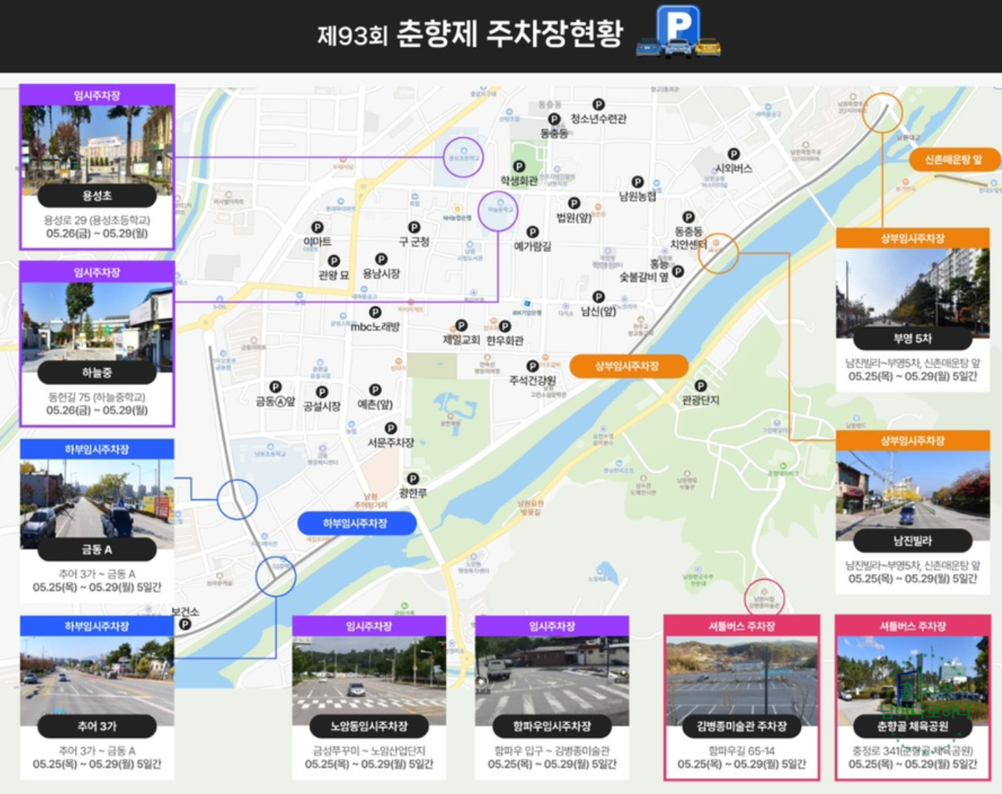 공식 홈페이지에 올려진 주차장 정보 입니다. 행사장 앞쪽은 매우 혼잡할 것으로 예상되오니, 임시 주차장과 주변 시설의 주차장을 이용하시는걸 추천 드릴께요.