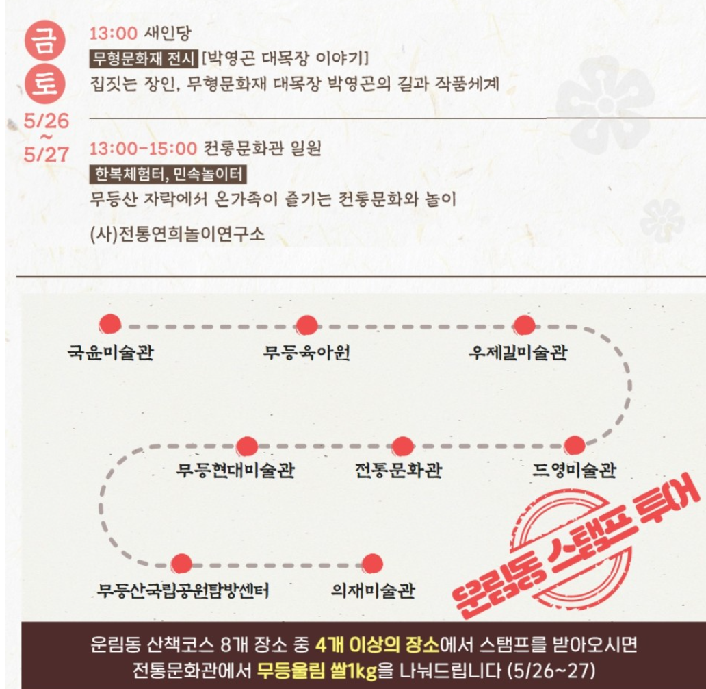 축제 기간 동안은 매일 다양한 프로그램이 진행되며, '구연동화'와 '망종 체험' 프로그램이 주목받습니다. 망종 체험에는 보리피리 만들기, 보리빵 먹기, 한복체험, 민속놀이 등이 포함되어 있습니다. 또한, 26일과 27일에는 '운림동 스탬프 투어'도 진행되는데, 운림동 미술관과 유관기관 전시에서 스탬프를 4개 이상 받아 인증하면 무등울림 쌀 1kg를 받을 수 있습니다.