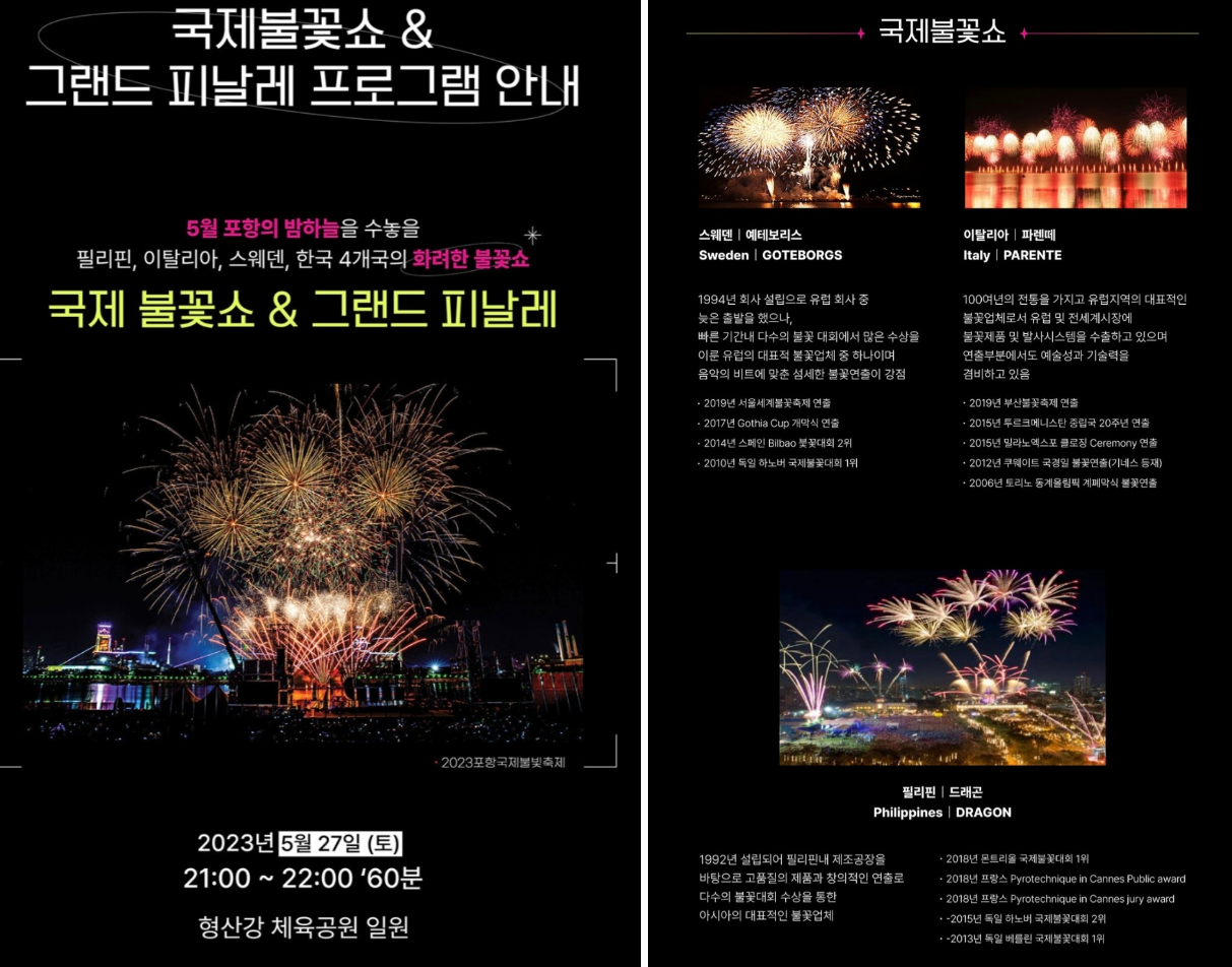 2023 포항국제불빛축제: 밤하늘을 아름답게 수놓는 불꽃의 향연이 펼쳐지는 포항의 대표적인 축제로, 2023년 5월 26일부터 28일까지 형산강 체육공원에서 3일간 개최됩니다. 이 축제는 불꽃을 통해 매년 수많은 관객들에게 환상적인 시각적 경험을 선사하며, 불꽃을 터뜨리는 순간마다 아름다운 빛과 화려한 색상이 하늘을 가득 채워 폭죽의 소리와 함께 아찔한 장관을 연출합니다.