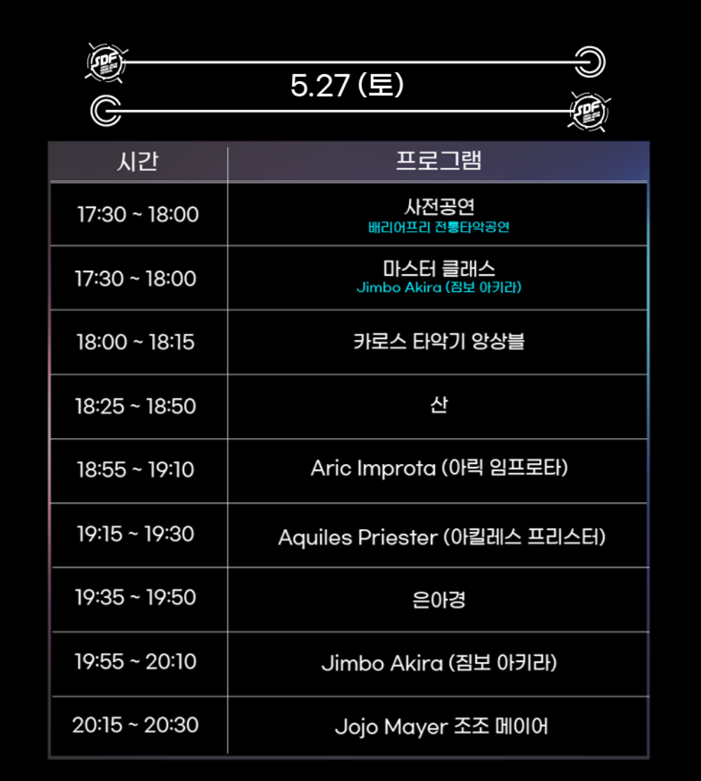 서울드럼페스티벌에는 다양한 아티스트들이 참여하며, 예를 들어 아키라 짐보, 조조 메이어, 아킬레스 프리스터, 아릭 임프로타, 이상민, 서수진, 정초롱 등이 포함됩니다. 국악 크로스 오버, 재즈 드러머, 슈퍼밴드 출신 드러머, 바디퍼커셔니스트 등 다양한 스타일의 아티스트들이 무대에서 드럼을 연주하며 다채로운 서울드럼페스티벌을 선보입니다.