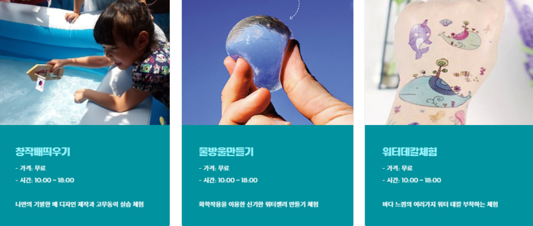 또한, 부대 프로그램으로는 마린 플로깅(바다에서 쓰레기를 주우는 친환경 체험), 화성 어촌체험마을 탐방, 독살체험, 수상 레저 기구 체험 등이 준비되어 있습니다.