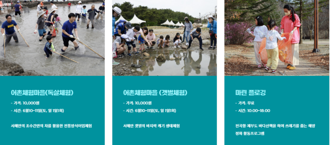 또한, 부대 프로그램으로는 마린 플로깅(바다에서 쓰레기를 주우는 친환경 체험), 화성 어촌체험마을 탐방, 독살체험, 수상 레저 기구 체험 등이 준비되어 있습니다.