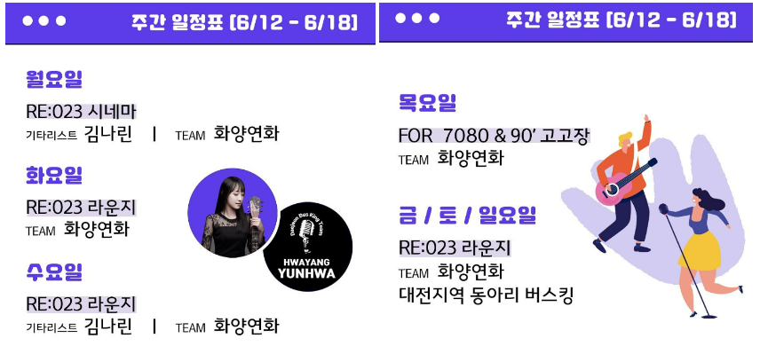 또한, 특정 기간동안 특별히 준비된 프로그램들도 있습니다. 예를 들어, 6 12일부터 18일까지는 김나린님과 화양연화팀이 공연을 준비하였고, 목요일에는 7080 & 90 고고장이, 주말에는 대전 지역 동아리 버스킹이 준비되어 있습니다.