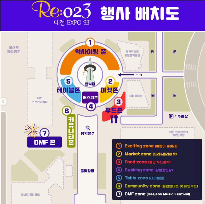 이번 대전 엑스포93 RE 023 축제의 장소는 한빛탑 일대입니다. 장소는 익사이팅존, 마켓존, 버스킹존, 푸드존, 테이블존, 커뮤니티존, DMF존 등 총 7개의 구역으로 나누어져 있어 참가자들이 다양한 프로그램을 즐길 수 있습니다. 각 구역은 축제 참가자들이 즐길 수 있는 다양한 프로그램이 준비되어 있어, 독특하고 다양한 경험을 제공합니다.