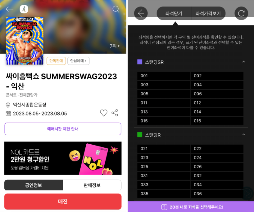 "흠뻑쇼"는 스탠딩SR석과 스탠딩R석을 추천합니다. 이 공간에서는 자유롭게 뛰어놀 수 있어요. 다만, 다리 아픔에 주의하셔야 합니다. 스탠딩석 예약 시, 옆 번호가 아닌 주변 좌석도 선택할 수 있습니다. 좌석을 선택할 때는 중간중간 좋은 자리가 나오므로 여유롭게 선택하시면 됩니다.