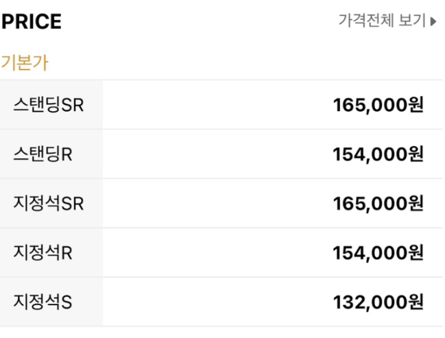 SR석은 165,000원, R석은 154,000원, S석은 132,000원입니다. 가격은 물가 상승으로 함께 상승할 수 있으니 참고하시기 바랍니다.
